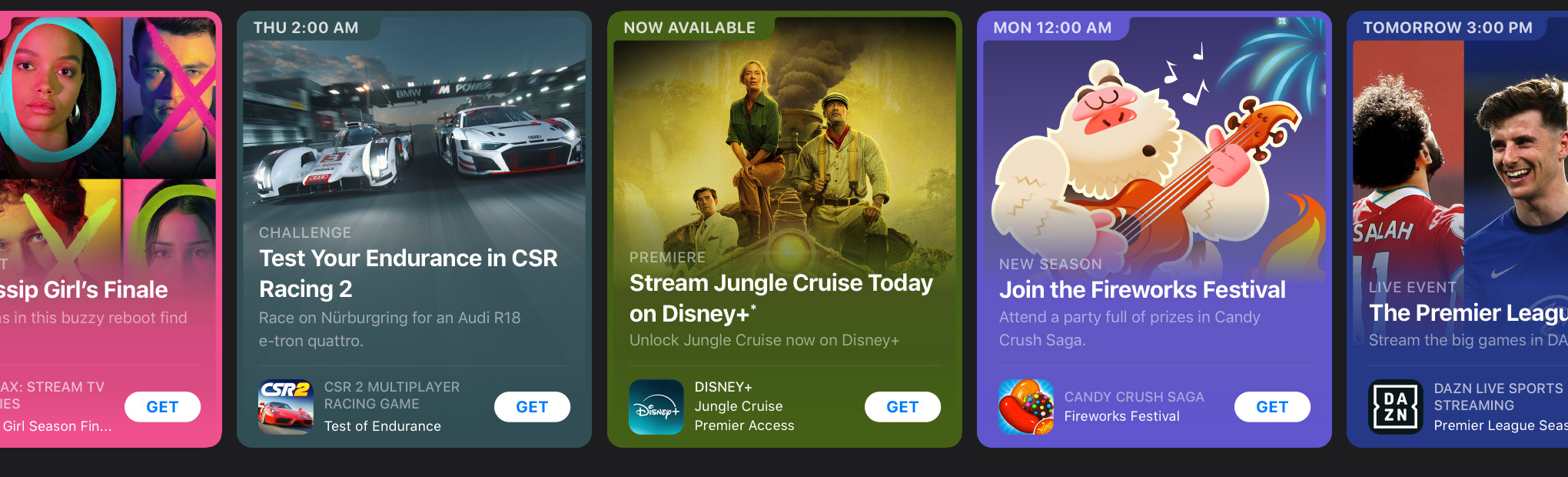 لدى App Store فريق تسويق عالمي غرضه الأوحد تحفيز الاكتشاف والمشاركة، إذ يجري إطلاق الحملات والبرامج لمساعدة مستخدمينا وتزويدهم بالمعلومات وتحفيزهم وفي الوقت نفسه تقديم يد المساعدة لمطورينا في ما يخص الترويج لتنزيل تطبيقاتهم وألعابهم وإعادة تنزيلها.