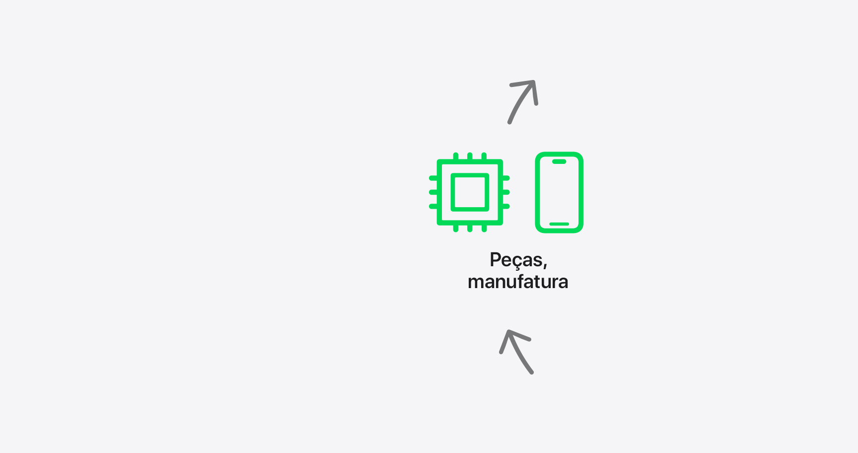 Fabricação. Os fornecedores nos ajudam a produzir elementos que são combinados para criar componentes essenciais, como telas, baterias e chips. Esses componentes são montados para se tornarem produtos Apple.