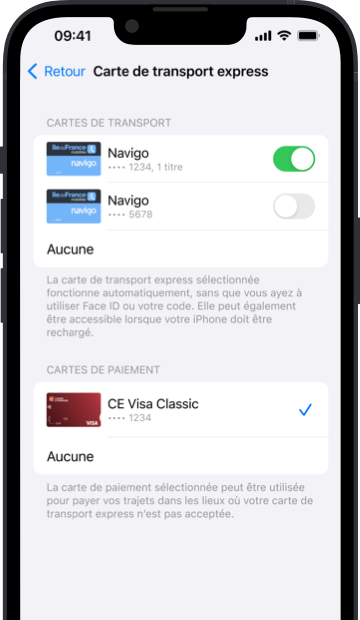 Le mode Express est automatiquement activé avec votre premier Navigo. Si vous en ajoutez d’autres par la suite, vous devrez définir celui que vous préférez utiliser dans l’app Cartes.