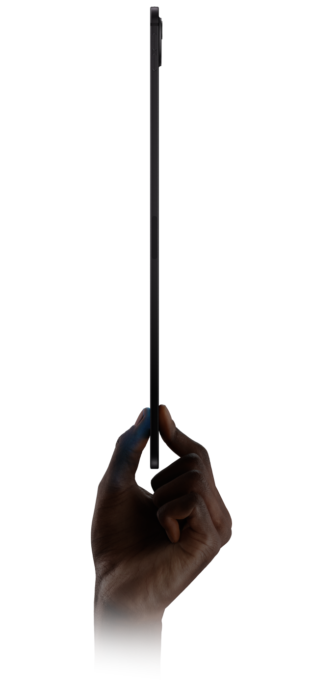 直向放置的太空黑 iPad Pro 機身正面,展示一幅數碼藝術作品,繪有藍色皮膚與編髮的富未來感的角色;一隻手以拇指和食指拿著 iPad Pro 底部,表現出機身的纖薄程度