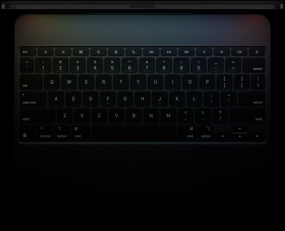 橫向放置的太空黑 iPad Pro,展示頂部邊緣輪廓,連接至精妙鍵盤;正面展示橫向放置的鍵盤,黑色背光鍵,專用功能鍵列:Escape 鍵、Tab 鍵、Caps Lock 鍵、Shift 鍵、Control 鍵、Option 鍵、Delete 鍵、Return 鍵;倒 T 形排列的方向鍵和內置觸控板。
