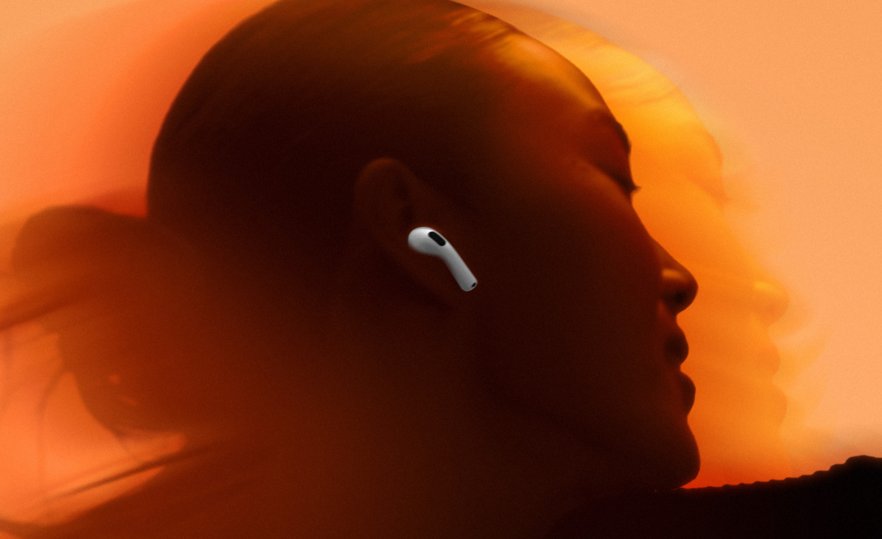 Audio Spasial Personal dengan pelacakan gerakan kepala dinamis1 menempatkan suara berkualitas sekeliling Anda, menciptakan pengalaman mendengarkan tiga dimensi untuk musik, acara TV, film, game, dan banyak lagi.