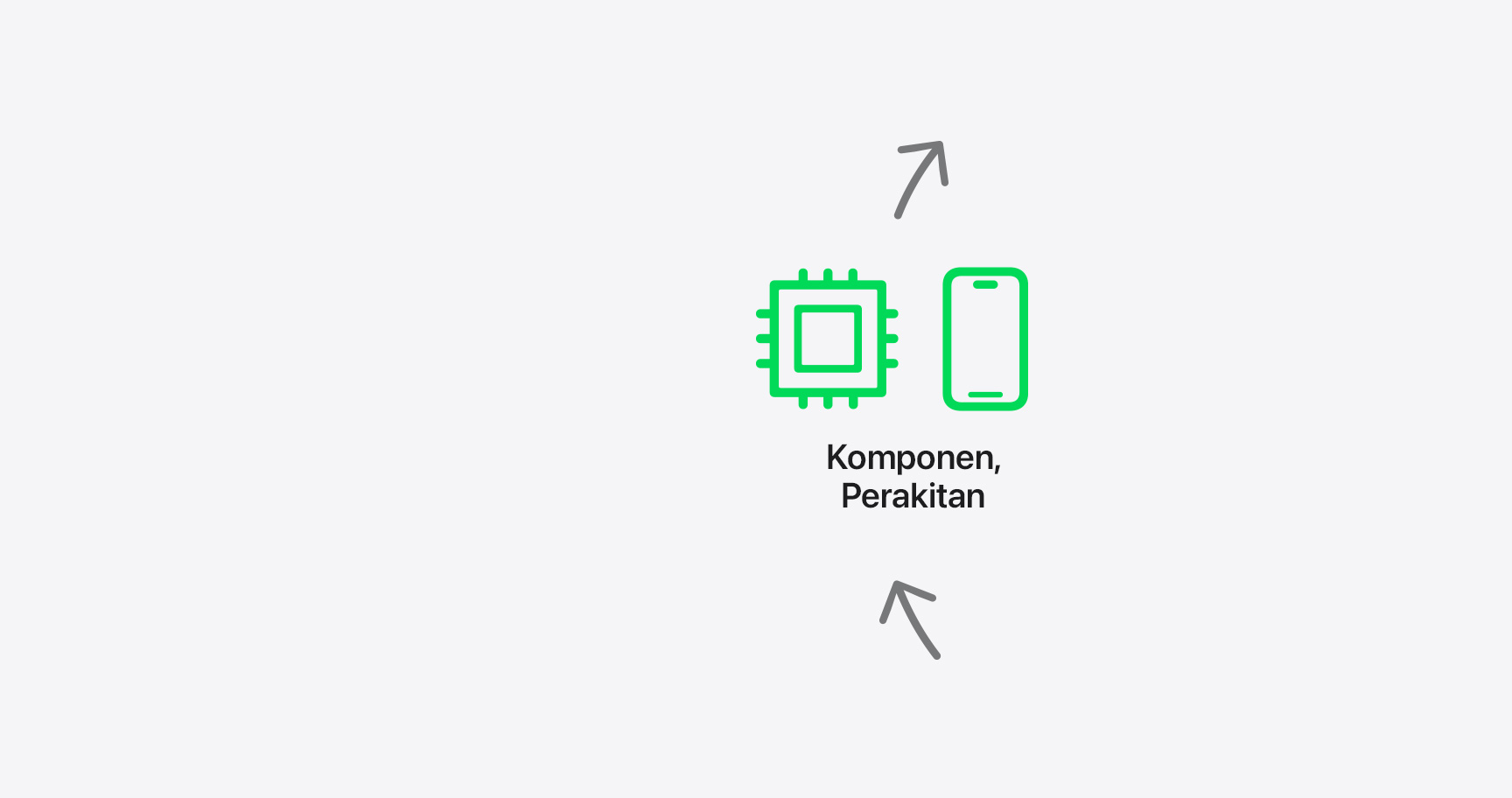 Produksi. Pemasok membantu kami mengembangkan komponen yang digabungkan untuk membuat komponen penting, seperti layar, baterai, dan chip. Semua komponen ini dirakit untuk menjadi produk Apple.