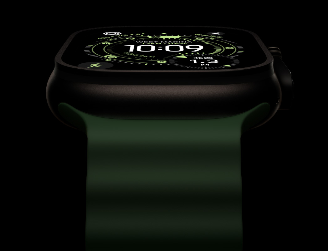 Apple Watch Ultra 3、チタニウムケース、カラーはナチュラル、オリエンテーリングの文字盤上のコンパス、ネオングリーンのオーシャンバンド