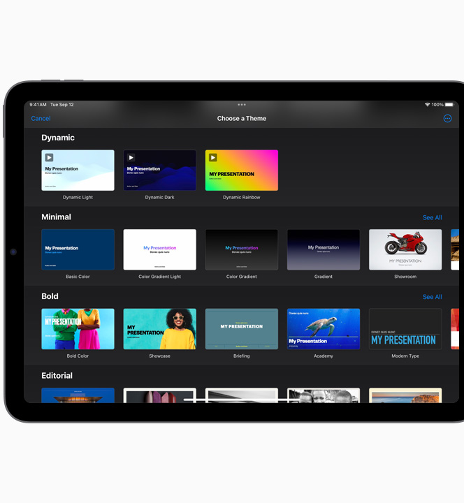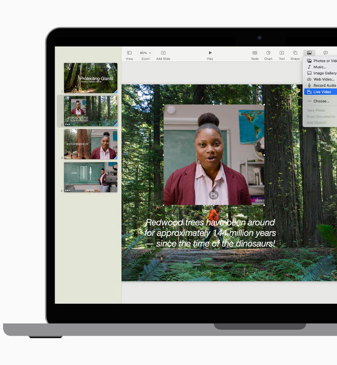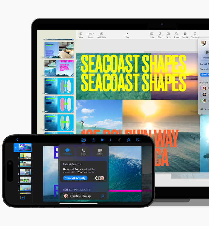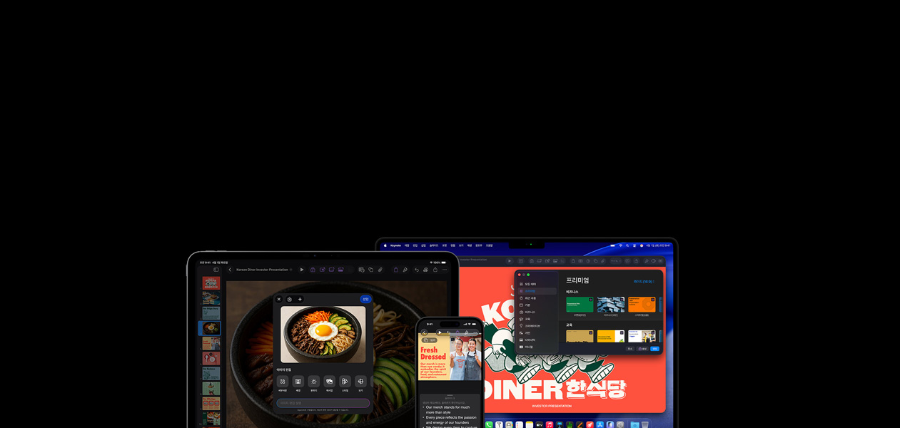 인상적인 프레젠테이션을 제작하고 실시간으로 공동 작업을 할 수 있도록, 직관적인 도구 및 효과들이 가득 마련돼 있습니다. Apple Creator Studio 구독자는 프리미엄 콘텐츠와 강력한 인텔리전스 기능도 이용할 수 있죠.
