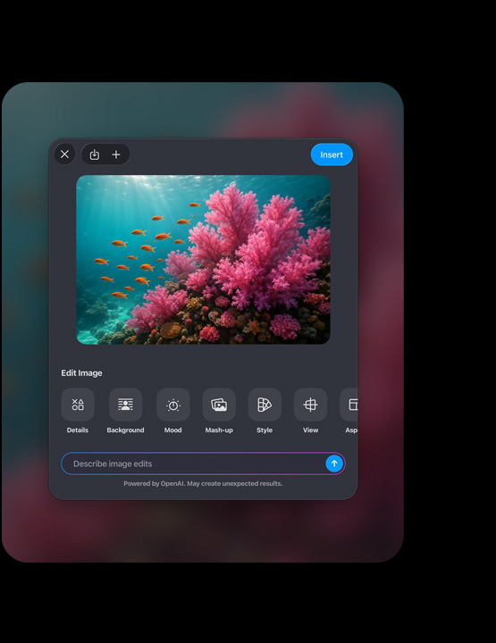 벡터 그래픽을 디자인하고, 강력한 인텔리전스를 탑재한 도구로 이미지를 편집하고, 전문적으로 제작된 템플릿을 사용할 수 있습니다. 이제 Apple Creator Studio에 포함.