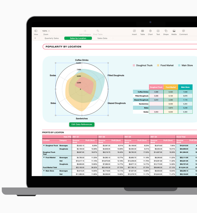 아름다운 스프레드시트를 만들고, 데이터를 시각화하고, 실시간으로 협업할 수 있습니다. Apple Creator Studio 구독자는 프리미엄 콘텐츠와 강력한 인텔리전스 기능도 이용할 수 있죠.