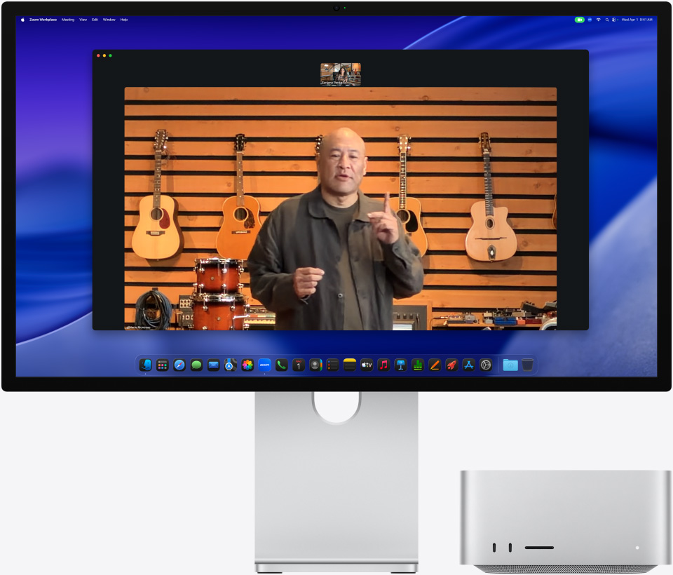 Studio Display XDR features a 12MP Center Stage camera with impressive image quality and low-light performance. Stay perfectly in frame during video calls, even as you move around or others join you. Desk View shows a top-down view of your workspace while keeping you onscreen. And Edge Light illuminates your face by creating a virtual ring light around the edges of the display.