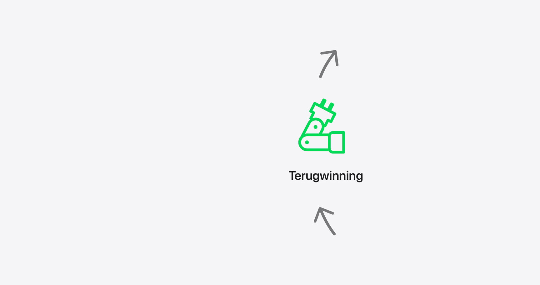 Terugwinning. Met de hulp van recyclingbedrijven zorgen we dat we producten kunnen hergebruiken. En bedenken we nieuwe oplossingen om zoveel mogelijk duurzame materialen terug te winnen. We delen onze kennis ook met de branche om samen stappen vooruit te zetten.