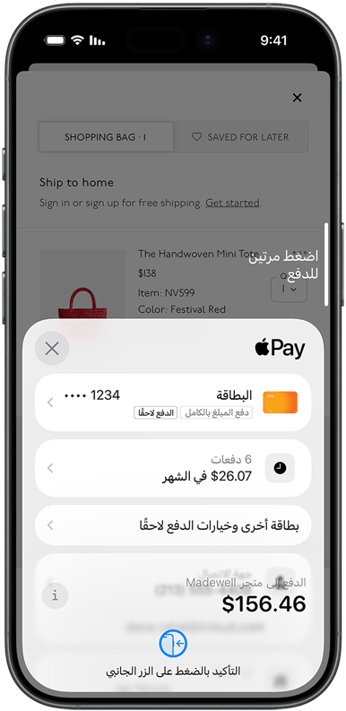 تمنحك Apple Pay خيارات مرنة للدفع عند التسوق في المتاجر باستخدام iPhone، أو عبر الإنترنت وداخل التطبيقات باستخدام iPhone أو iPad، وتمكّنك من تسديد قيمة مشترياتك بالكامل أو تقسيطها على دفعات شهرية ميسّرة من خلال بطاقة مؤهلة.2