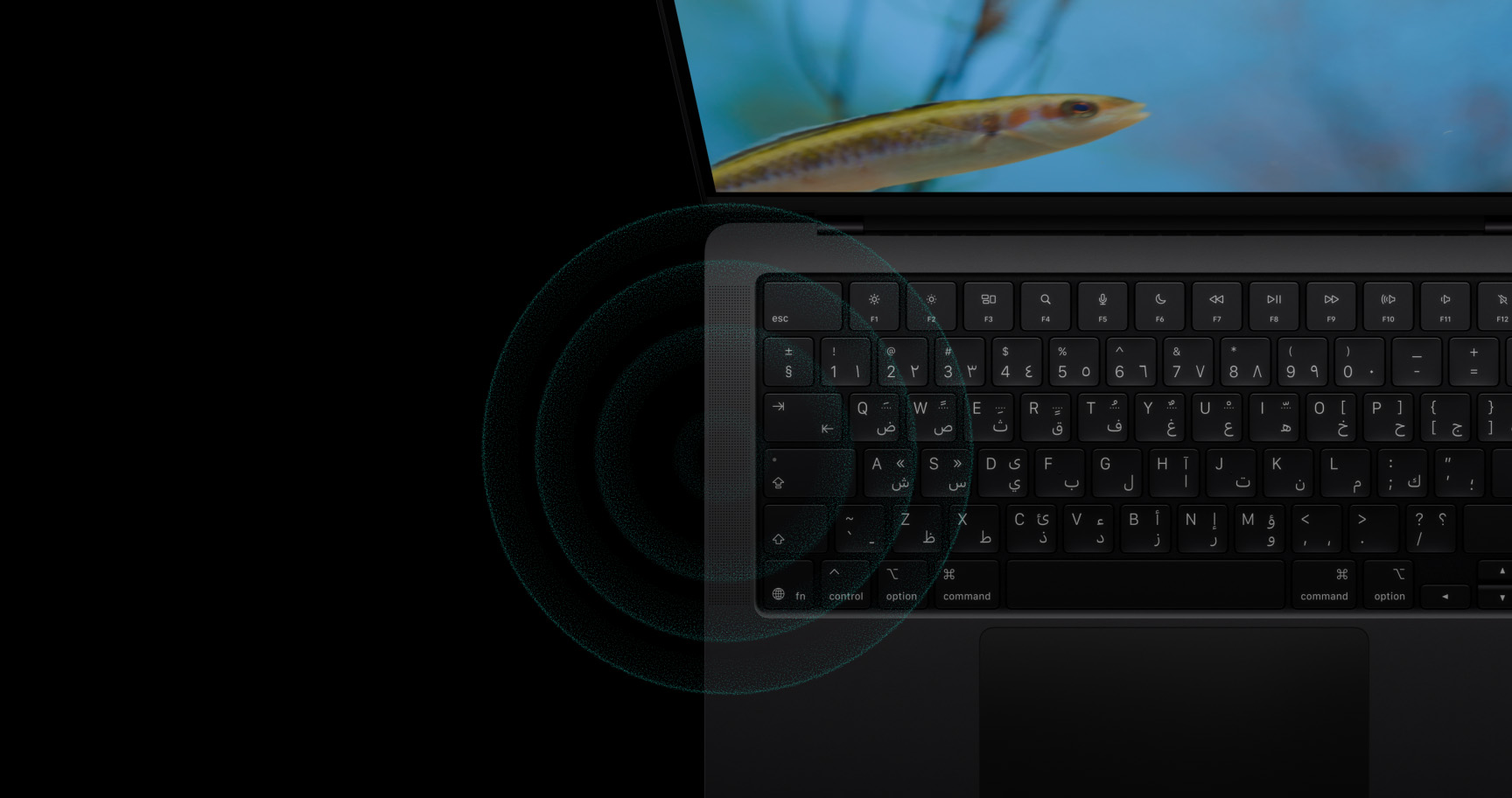 الميكروفونات ومكبرات الصوت. مع مصفوفة من ثلاثة ميكروفونات بجودة الاستوديوهات، ونظام صوت من ستة مكبرات يدعم الصوت المكاني وDolby Atmos، يضيف MacBook Pro تجربة صوتية مذهلة أينما حلّ.