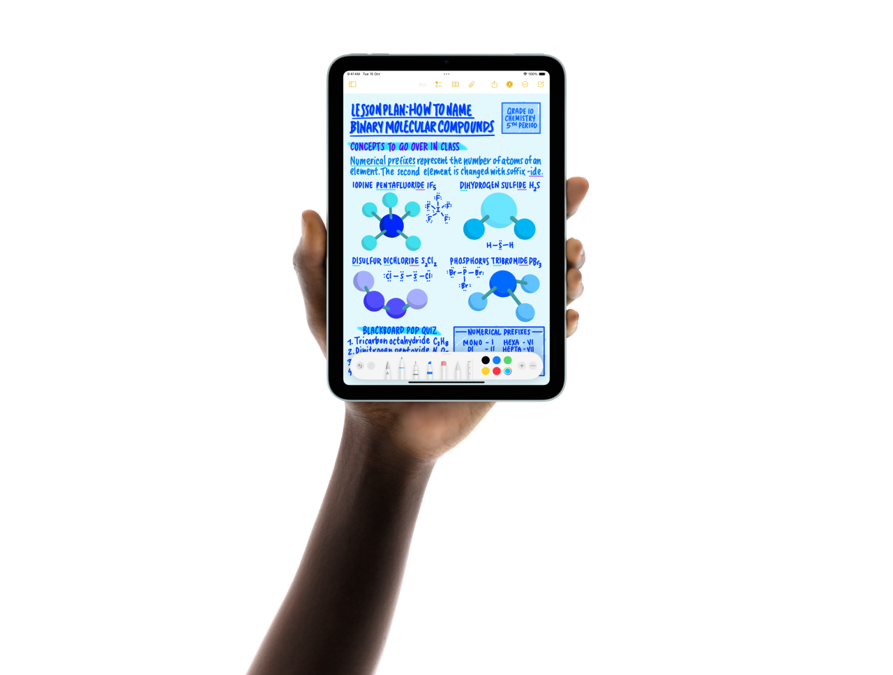 The blazing-fast A17 Pro chip makes iPad mini a portable powerhouse. It delivers a big boost in performance and it’s built for Apple Intelligence. The 16‑core Neural Engine is up to 2x faster than the previous generation. The 5‑core GPU brings advanced features like hardware‑accelerated ray tracing for graphically intense triple‑A games. And you can work, play, and create from anywhere with all‑day battery life.3