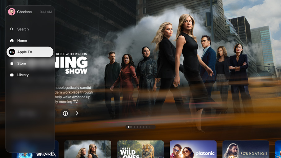 Spatial Audio immerses you in Dolby Atmos, 5.1 or 7.1 surround sound that feels like it’s coming from every direction.11 Connect HomePod for three‑dimensional audio that places you in the middle of the action. Or connect AirPods for a personal theatre experience with sound that automatically adjusts to stay centred on the TV even if you move around the room.
