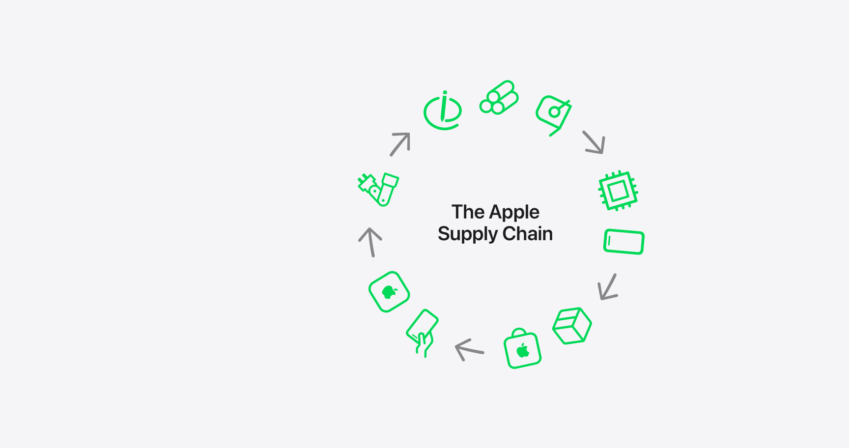 Our supply chain includes thousands of supplier facilities in over 60 countries. Suppliers support every stage of the Apple product lifecycle, and we apply our strict requirements globally to move our partners, ourselves, and the industry forward.