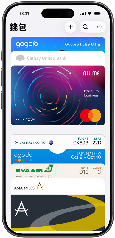 錢包該有的,全都有。 你的信用卡、簽帳金融卡、登機證、票券與酬賓卡,甚至連機車鑰匙等,都能放在「錢包」app 中2。只要以 iPhone 或 Apple Watch 就能使用,因此隨身攜帶的東西更少,能做的卻更多3