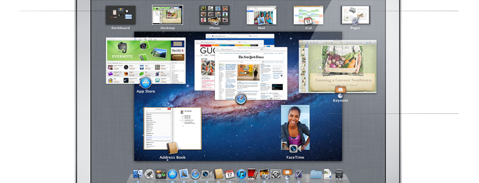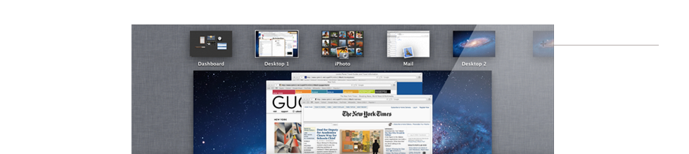 在 Mission Control 裡,螢幕上方有一排縮圖檢視分別代表 Dashboard、桌面空間與全螢幕的應用程式。螢幕下方則以 Exposé 方式,顯示依應用程式分類的開啓中視窗。只要往左右滑動,或是點按縮圖檢視,即可前往要去的地方。